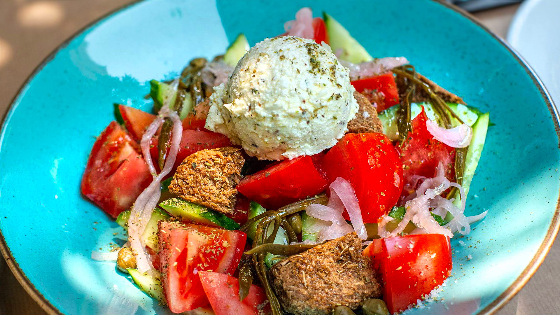 This restaurant offers a delightful surprise with its wide variety of cheeses from all over Greece, as well as the presence of many local, unique products throughout the menu. It prioritizes local ingredients that highlight the country's productive and gastronomic heritage. The menu eschews traditional categories like appetizers, mains, or sides, instead embracing the ethos of meze, encouraging shared tasting experiences. While some heavier options like grilled feta with sausage and pastrami or pork stew with leeks may seem daunting, they are balanced by daily specials dominated by seafood, fish, and seasonal ingredients. Among the highlights are mushrooms sautéed with thyme, Karpathian pasta with spinach, confit cherry tomatoes and Nivato cheese, and meatballs flavored with ouzo and mint. The restaurant also serves some of the best fried potatoes, crispy, freshly fried, and perfectly seasoned. Both desserts, a chocolate waffle with vanilla ice cream and deconstructed galaktoboureko with light semolina cream and crispy filo pastry, are indulgent and refreshing.